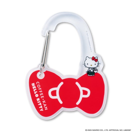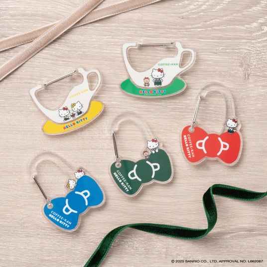バッグなどに取り付けて楽しめるカラビナは、シークレットを含む全6種類。ハローキティのトレードマークであるリボンや『珈琲館』のカップ&ソーサーのモチーフに、『珈琲館』の制服を着た「ハローキティ」と双子の妹“ミミィ”、お友だちの「タイニーチャム」を描いています。