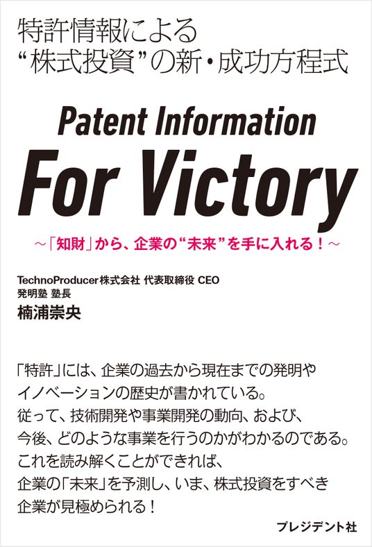 TechnoProducer株式会社(東京都千代田区、代表取締役CEO:楠浦崇央)は、2冊目となる新刊『Patent Information For Victory ~「知財」から、企業の"未来"を手に入れる!~』(プレジデント社)を2024年9月30日に発売することを発表しました。本書の予約販売は9月10日よりAmazonにて開始しております。