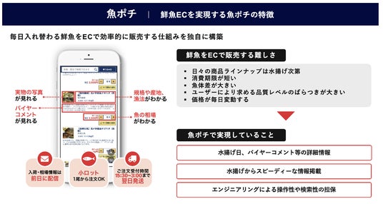 『魚ポチ』は「料理人の仕入れ時間を減らし、欲しい食材をどこにいても、すぐに手に入れられる世界」をサービスビジョンとして飲食店向けに全国の産地や中央卸売市場から仕入れた商品をインターネットを介して卸売りするサービスです。飲食店は各店コンセプトやメニューが違い、また店頭在庫に応じて日々の仕入れを管理する必要があり、その多くは自ら卸売市場に出向き在庫の補充や当日のメニューを考えていました。魚ポチではあらゆる飲食店の経営者及びスタッフがより店舗運営に集中できるように、豊富な商品をウェブサイト上で販売しており、1尾から商品を店頭まで配送しています。累計40,000店舗以上の飲食店様にご登録いただいています。