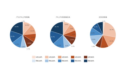 豆乳自販機の女性比率は、アキュアの自販機全体(38.5%)やプラスアキュア自販機(44.8%)と比べても圧倒的に高く、半数を超える59.7%となっています。