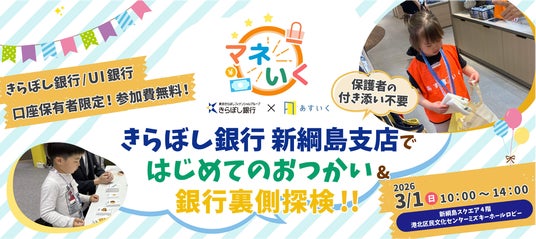 一時保育検索・予約サービス「あすいく」、および体験型一時保育サービス「ワクいく」を運営する株式会社あすいく(本社:東京都港区、代表取締役:幸脇 啓子)は、体験型一時保育プログラム「マネいく」において、株式会社きらぼし銀行(本店:東京都港区、取締役頭取:渡邊 壽信)と連携し、きらぼし銀行 新綱島支店(新綱島スクエア)にて、未就学児を対象とした「マネいく~きらぼし銀行・新綱島支店ではじめてのおつかい&銀行裏側探検!!」を2026年3月1日(日)に実施しました。