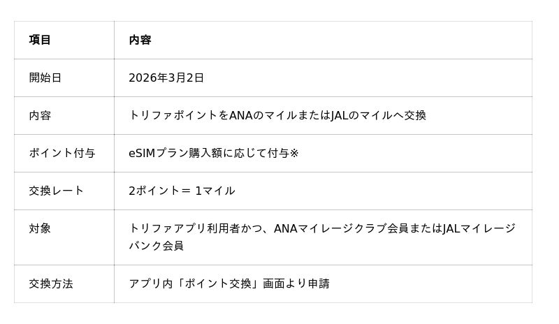 株式会社トリファ(本社:東京都品川区、代表取締役:嘉名 雅俊、以下「トリファ」)は、全日本空輸株式会社(以下「ANA」)および日本航空株式会社(以下「JAL」)との連携により、海外eSIMアプリ「トリファ」の利用で貯まるポイントをANA・JALのマイルへ交換できるサービスを2026年3月2日より開始いたします。海外eSIMサービスがANAマイレージクラブ・JALマイレージバンクのマイル交換に同時連携するのは世界初※となります。