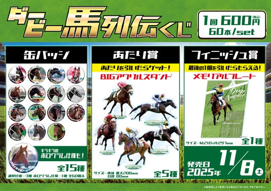 株式会社ジュウロクホウイ(本社:東京都千代田区、代表取締役:赤松 武雄)は、ファーロンズ合同会社監修のもと、ディープインパクトやナリタブライアンといった競走馬界のレジェンドホースを一同に集めた『ダービー馬 列伝くじ』を2025年11月8日(土)~全国のドン・キホーテ、アピタ、ピアゴ限定で発売します。