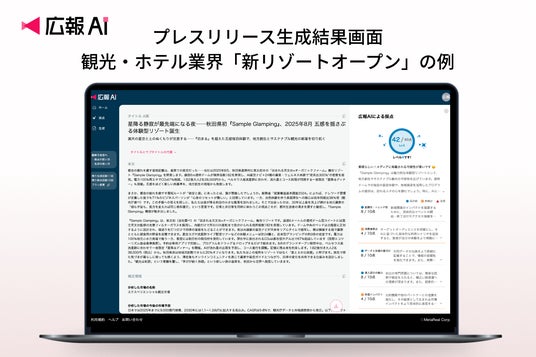 メタリアル・グループの株式会社ロゼッタ(本社:東京都千代田区、代表取締役:五石 順一)が提供する、メディアに掲載されやすいプレスリリースを生成・採点可能な『広報AI』が、観光・ホテル業界のプレスリリース作成に対応しました。宿泊施設や観光イベントの告知、季節キャンペーンなど、地域の魅力や体験価値を読者に伝えるリリースを迅速かつ効果的に生成します。