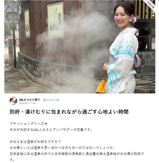 旅好きな方が集まる「旅色LIKES」メンバーへまだ知られていない地域の魅力をお届けし、実際に訪れていただきたいとの思いから参画しました。ブログでは、広く知られている観光スポット情報などにとどまらず、旅好きなJAL社員だからこそ知る、地域のとっておきの魅力をご紹介しています。また、親しみを感じていただけるようJAL社員の顔を出し、季節性や話題性のある情報を発信しております。