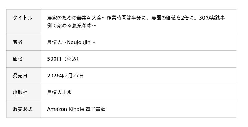 農業の課題解決を支援する株式会社農情人(本社:千葉県船橋市、代表取締役:甲斐雄一郎)は、Amazon Kindle「農学」売れ筋ランキング1位(※1)を獲得した書籍『農家のための農業AI大全 ~作業時間は半分に、農園の価値を2倍に。30の実践事例で始める農業革命~』を、2026年3月14日(土)~16日(月)の3日間限定で無料公開いたします。スマホの音声入力だけで使える30事例超のプロンプトテンプレートと、プログラミング不要でアプリを自作する「Vibe Coding」入門を収録した、中小規模農家のためのAI実践書です。