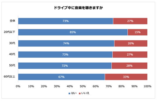 ドライブ中に音楽を聴く人は73%で、多くの人がドライブ中に音楽を聴いていることがわかりました。年代別に見ると、年代が下がるにつれて音楽を聴く比率が高くなり、20代以下は唯一8割を超え60代以上と18ポイント差となりました。