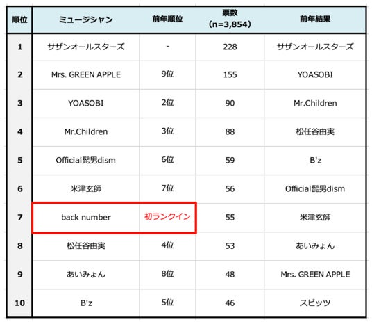 4位以下のほとんどは前回の調査でもトップ10に入ったミュージシャンが占めましたが、今回初めて「back number」が7位にランクインしました。