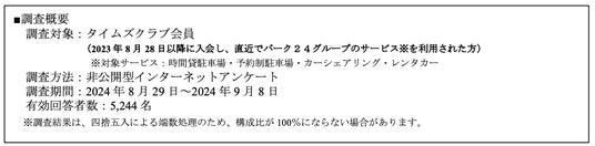 ※入会金・年会費無料の会員制ポイントプログラム。タイムズパーキングやタイムズカー、タイムズカーレンタルの利用等でポイントがたまる他、会員限定サービス等を提供。会員数約1,184万人(2024年9月末現在)。なお、本アンケートは、駐車場やカーシェアリング、レンタカー等のクルマに関わるサービスを利用した方々を対象としたものです。