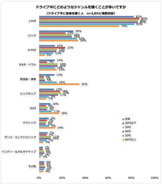 ドライブ中によく聴く曲のジャンルは「J-POP」82%が最も多く、2位以下と50ポイント以上の大きな差がありました。ジャンルごとで年代による差を見ると、「歌謡曲・演歌」は、60代以上の比率が他の年代より19ポイント以上高くなりました。また、「K-POP」は、20代が最も高く、60代と18ポイントの差がありました。