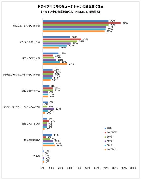 「ドライブ中に最もよく聴くミュージシャン」の曲を聴く理由は、「そのミュージシャンが好き」73%が最多でした。以降「テンションが上がる」30%、「リラックスできる」18%と続きました。