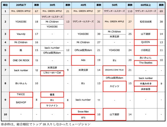 年代別で見ると、「サザンオールスターズ」は50代以上、「Mrs.GREEN APPLE」は40代以下の各年代でトップとなりました。両ミュージシャンは、30~50代で2位以内にランクインしており、幅広い年代から多くの支持を集めています。また、「Vaundy」は20代以下から、「山下達郎」は50代以上から多数の票を獲得するなど、年代別の特徴がみられました。洋楽でランクインしたのは60代以上で4位の「QUEEN」、6位の「The Beatles」のみでした。