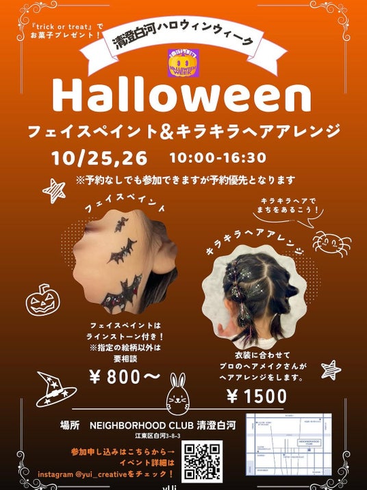 フェイスペイント&キラキラヘアアレンジ清澄白河のNEIGHBORHOOD CLUB 清澄白河にて子どもが仮装をもっと楽しめる「フェイスペイント&キラキラヘアアレンジ」を実施します。