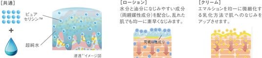敏感でラメラ構造が乱れた肌は、うるおいがなじみにくい状態です。そこでピュアセリシン(TM)と超純水※1によって肌への浸透※2をより高めた処方を採用し、荒れた肌にもうるおいをすみずみまで浸透※2させることを実現しました