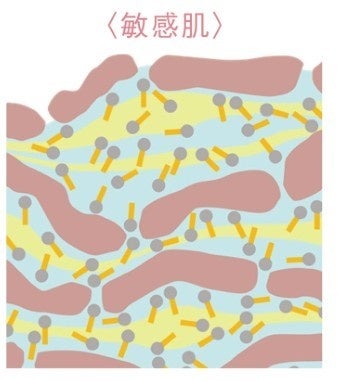 敏感肌は年齢を重ねるほどに、表皮全体のセラミドが少なくなるため、セラミドの向きがばらばらになりすき間が増え、水分が蒸散して肌が乾燥します。さらに刺激に関する感受性が高まり炎症もおこしやすい状態になります。