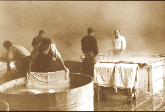 総合繊維メーカー発のエイジングケア化粧品ブランドで、ピュアセリシンを高配合しております。祖業の精練(絹織物の水洗い 図1)に携わる職人の手は、厳しい水仕事にもかかわらず、いつも白く輝いていました。当社はこの秘密が、絹に含まれるタンパク質「セリシン」であることを突き止め、「ピュアセリシン(TM)」を開発しました。