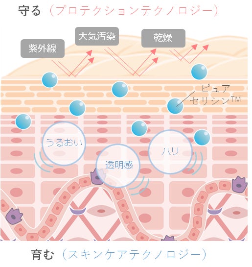 ピュアセリシン研究の結果導き出された、守って育む2つのテクノロジーで紫外線・大気汚染・乾燥などの環境ストレスから肌を守りながら、うるおいを育み、敏感肌やエイジングに悩む肌も健やかな肌へと導きます。