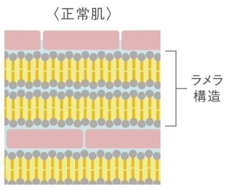 正常な肌はセラミドが整列していてラメラ構造がびっしり詰まっています。そのため水分の蒸散を防いで肌のうるおいを保つことができます。