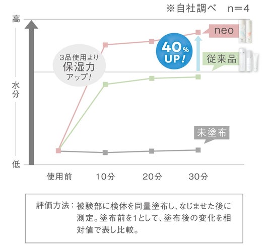 コモエース ネオの2品は従来品の3品使用と比較しても保湿力がアップすることが分かりました。