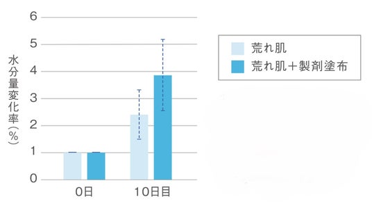 前腕内側部に人工的な荒れ肌(敏感肌モデル)を作製し、ピュアセリシンを配合した製剤※を10日間肌に連用した結果、水分量の増加が確認された。