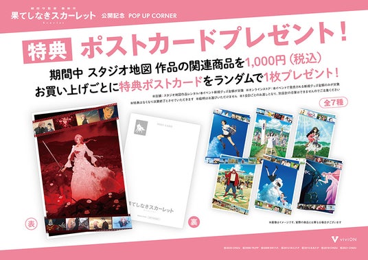 さらに、スタジオ地図作品の関連商品を1,000円(税込)お買い上げごとに特典ポストカード(全7種)をランダムで1枚プレゼントいたします。