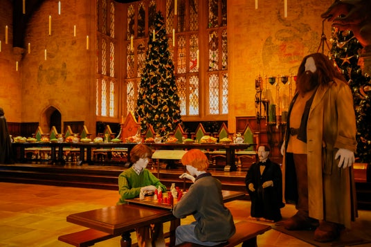 大広間には、映画『ハリー・ポッターと賢者の石』の印象的なシーン──魔法のチェスをするハリーとロンの姿も再現されています。クリスマス休暇を家で過ごす生徒が多いなか、ホグワーツに残ったふたりが静かに過ごす冬の日。華やかな装飾の中で、どこか温かく穏やかな時間が流れる瞬間を切り取ったような空間が広がります。