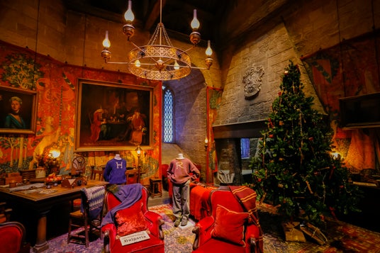 ハリーたちが学生生活を送ったグリフィンドールの男子寮と談話室も、期間限定でツリーが飾られ温もりを感じられる空間に。さらに、寮のテーマカラーである赤を基調とした室内にロンの母の手編みのセーター姿のハリーロンの姿も見受けられ、映画『ハリー・ポッターと賢者の石』で描かれたクリスマスの朝のシーンを思わせる温かな空間が作られています。