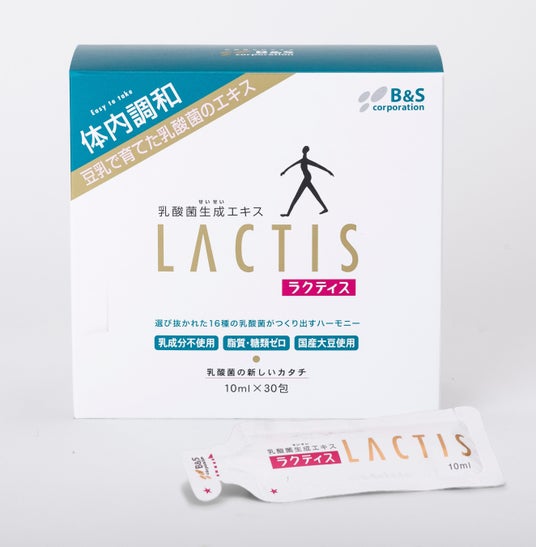 乳酸菌生成エキス「ラクティス」は、独自の16種類の乳酸菌で豆乳を発酵し、1年間熟成。有用成分のみを抽出したエキスです。生きた乳酸菌ではなく、乳酸菌が発酵中につくりだす成分と熟成中にバラバラになった乳酸菌の菌体成分でできています。この2つの成分がわたしの乳酸菌にはたらきかけ、健康をサポートします。