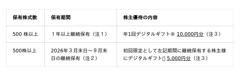 (注2)「2026年3月末日~9月末日の継続保有」とは、2026年3月末日を株主優待制度の基準日とし、2026 年3月末日及び 2026 年9月末日の株主名簿に2回連続して、500 株以上の保有が同一株主番号にて記載又は記録される状態を指します。