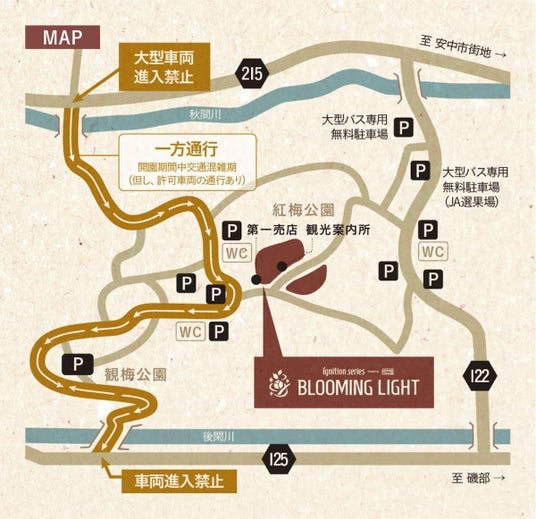 - 開催場所: 秋間梅林 イルミネーション入り口第一売店付近にて受付