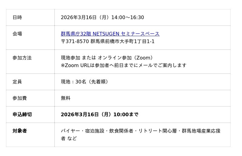バイヤー・宿泊施設・飲食関係者の皆さま、群馬の地場産業・ものづくりに関心をお持ちの方、ぜひこの機会にご参加ください。