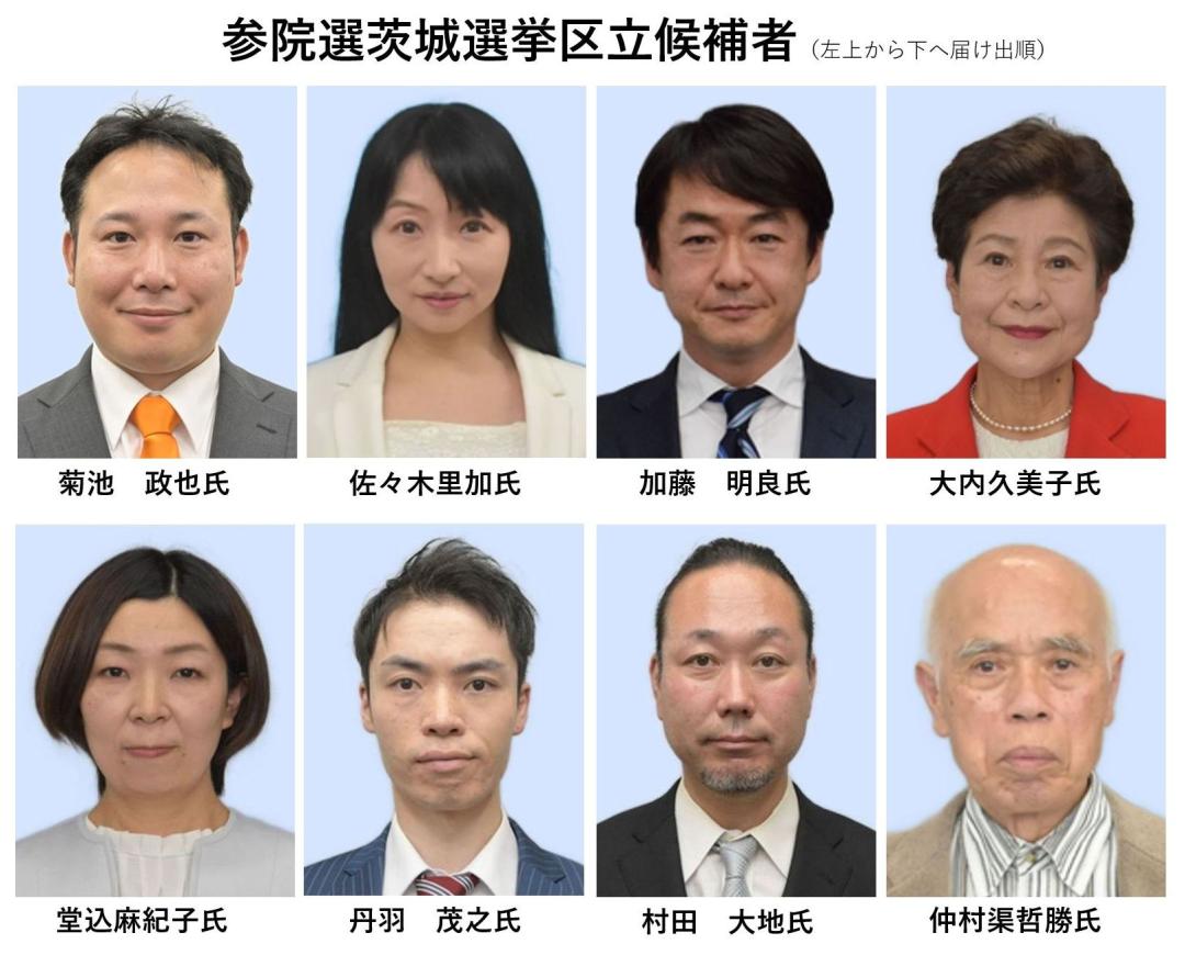 茨城選挙区に立候補しているのは、政治団体「参政党」の菊池政也氏(37)▽無所属の堂込麻紀子氏(46)=立民・国民推薦▽維新の佐々木里加氏(55)▽NHK党の丹羽茂之氏(30)▽自民の加藤明良氏(54)=公明推薦▽NHK党の村田大地氏(45)▽共産の大内久美子氏(72)▽無所属の仲村渠哲勝氏(80)の8人。