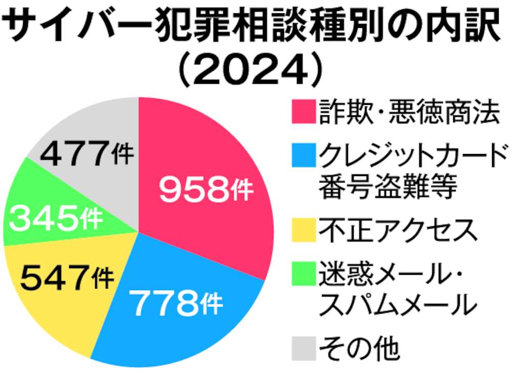 相談件数は、24年は3015件で前年より153件減少したが、22年から3千件台で高止まりしている。相談内容は、クレジットカード番号がだまし取られたり、個人のIDやパスワードを利用されインターネットバンキングに不正送金されたりする被害などがあったという。同課の担当者は「クレジットカード情報や口座番号など重要な個人情報を守るため、安易にサイトを開かないで」と警鐘を鳴らしている。