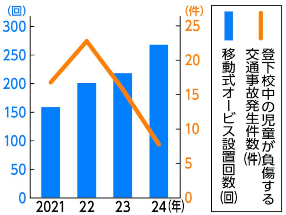 設置回数の増加に伴い、登下校中の児童が負傷する事故は、23年に前年比7件減の16件、24年に半減の8件と2年連続で減少。導入前3年間の平均20件より少なかった。幅員5.5メートル未満の道路の事故も2年連続で減少し、24年は前年比73件減の378件だった。