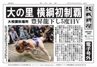 大相撲秋場所千秋楽は28日、東京都墨田区の両国国技館で行われ、東横綱大の里(25)=本名中村泰輝、石川県出身、二所ノ関部屋(阿見町)=が13勝2敗で並んだ西横綱豊昇龍(26)との優勝決定戦を制し、2場所ぶり5度目の優勝を果たした。横綱として昇進2場所目で初制覇。