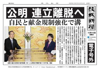 公明党は10日、自民党との連立政権の枠組みから離脱することを決めた。高市早苗総裁選出を受けた連立協議を巡り、企業・団体献金の規制強化や派閥裏金事件の真相解明を求めたが、溝は埋まらず、自民の不信払拭に向けた努力が不十分と判断した。政策ごとの協力は継続し、選挙協力は人物本位とする方向だ。公明は1999年10月に自民、自由両党連立政権に参加。自公が下野していた時期を除き、22年以上の連立の歴史が幕を下ろす。