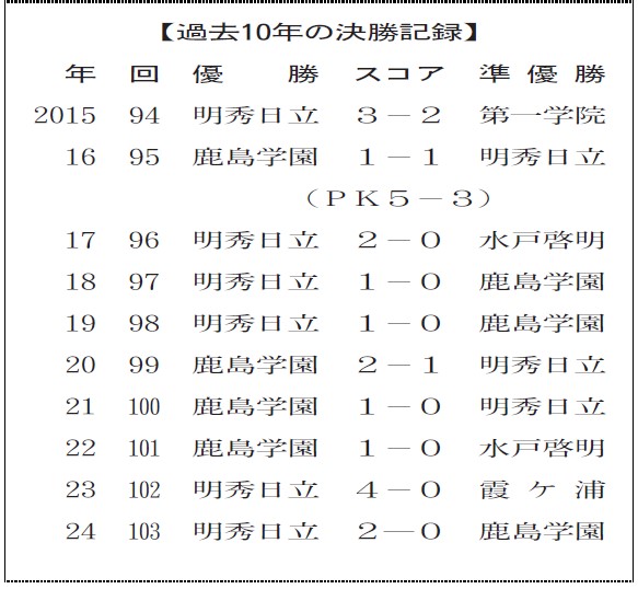 サッカーの第104回全国高校選手権茨城県大会は9日午後1時から、メルカリスタジアムで決勝を行い、3年ぶり12度目の優勝を狙う鹿島学園と、3年連続7度目の優勝を目指す明秀日立がぶつかる。