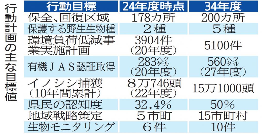 目標値では、県立自然公園や鳥獣保護区、自然環境保全地域など、生態系の保全や回復を図る区域について、現状の178カ所から1割増の200カ所まで広げる。民間事業者らが森林や緑地保全に取り組む「自然共生サイト」の整備を促すことで、生態系の改善を目指す。