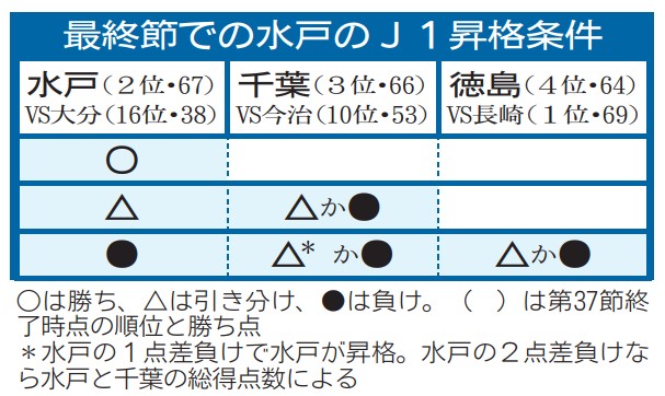 最終節は29日、ケーズデンキスタジアム水戸で大分と戦う。水戸は勝てばJ1自動昇格圏の2位以上が確定する。引き分けや負けた場合でも、勝ち点66で3位の千葉と同64で4位の徳島の結果次第でJ1昇格が決まる。また、リーグ優勝を決めるには水戸の勝利が必須で、勝ち点69で首位の長崎が引き分けか負ける必要がある。