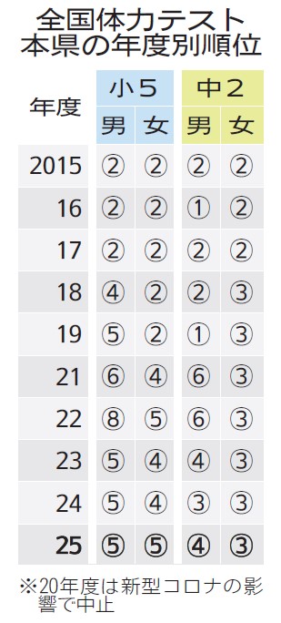 県教委保健体育課は、好成績を維持できた要因について、「各学校が課題に応じた体力アップ推進プランを立て、取り組んできた成果が表れている」と分析した。