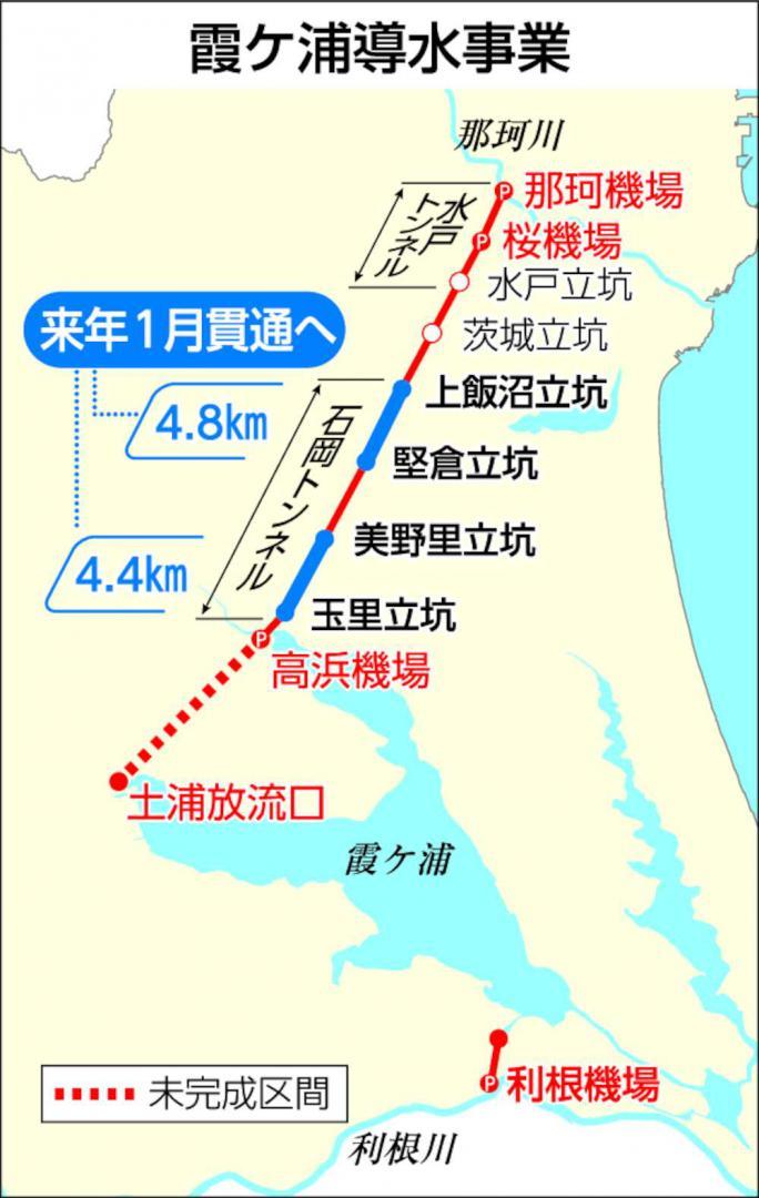 事業は霞ケ浦と利根川、那珂川を総延長45.6キロの地下トンネルで結び、水を相互に送る。霞ケ浦や千波湖の水質浄化のほか、那珂川や利根川の渇水対策や、茨城県と千葉県、東京都への水道・工業用水供給を目指す。全事業は30年度の完成を予定する。