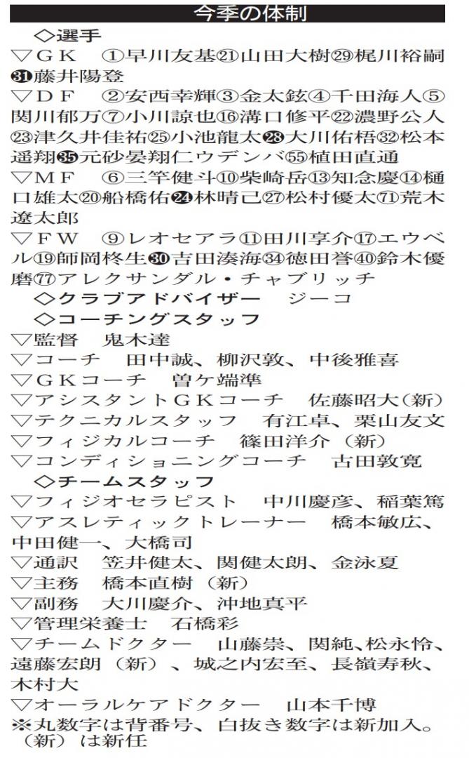 目標の連覇に向け、リーグ最優秀選手賞(MVP)のGK早川や、21ゴールで得点王のFWレオセアラが昨季のキャリアハイを塗り替えたい。ベストイレブンに選ばれたDF植田、10得点5アシストのFW鈴木の活躍も必要不可欠。大幅な戦力の入れ替わりがないことから、鬼木サッカーの浸透も促進されるはずだ。