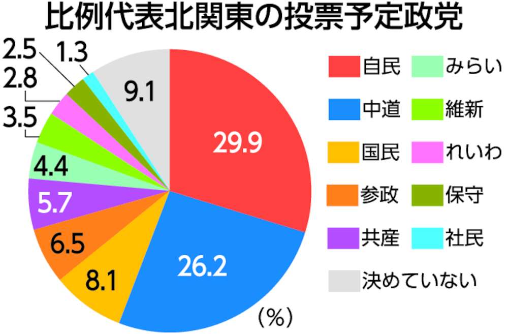 調査結果によると、北関東ブロックの投票予定政党は、自民が29.9%のトップで、中道が26.2%と続いた。両党とも浮動票の取り込みなどで、議席のさらなる上積みを図る。