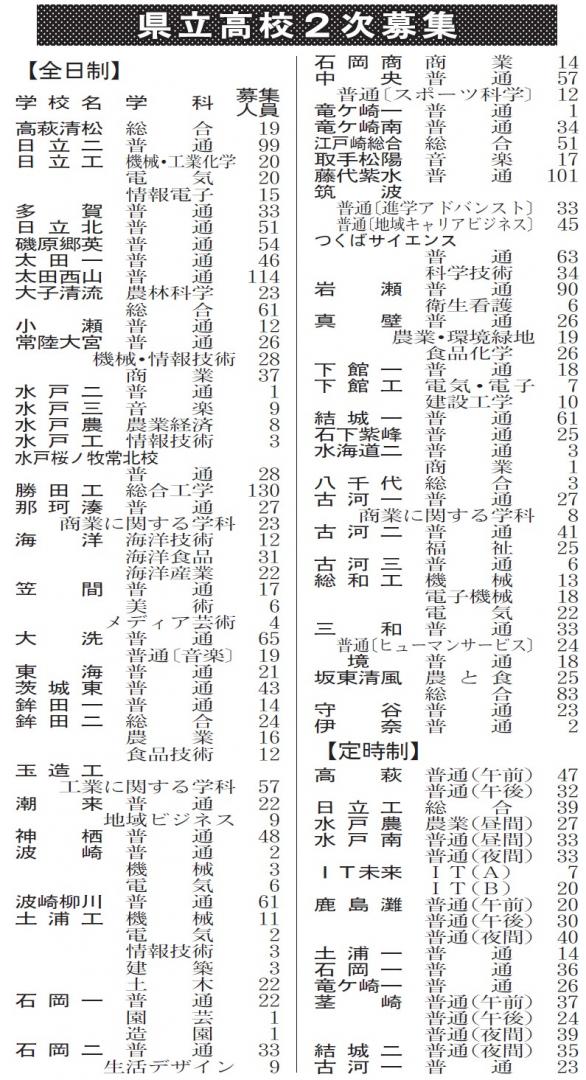 2次募集は全日制が前年より11校22学科増の59校96学科で、募集人員は前年比734人増の2633人。定時制は横ばいの12校19学科で募集人員は同59人増の562人。