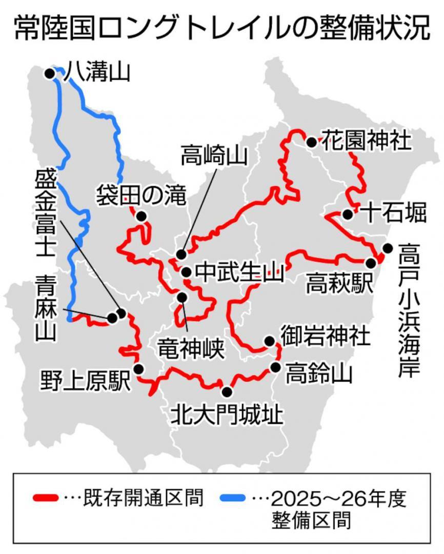 茨城県北6市町の里山や観光名所を結ぶ「常陸国ロングトレイル」が、2026年夏に全線開通する見通しとなった。常陸大宮-大子間の70キロ区間を整備し、周回型コースとしては国内最長の全長350キロが完成する。県は来年度、開通に合わせたイベントの開催や専用マップの再編集などを進め、国内外からのさらなる誘客を目指す。