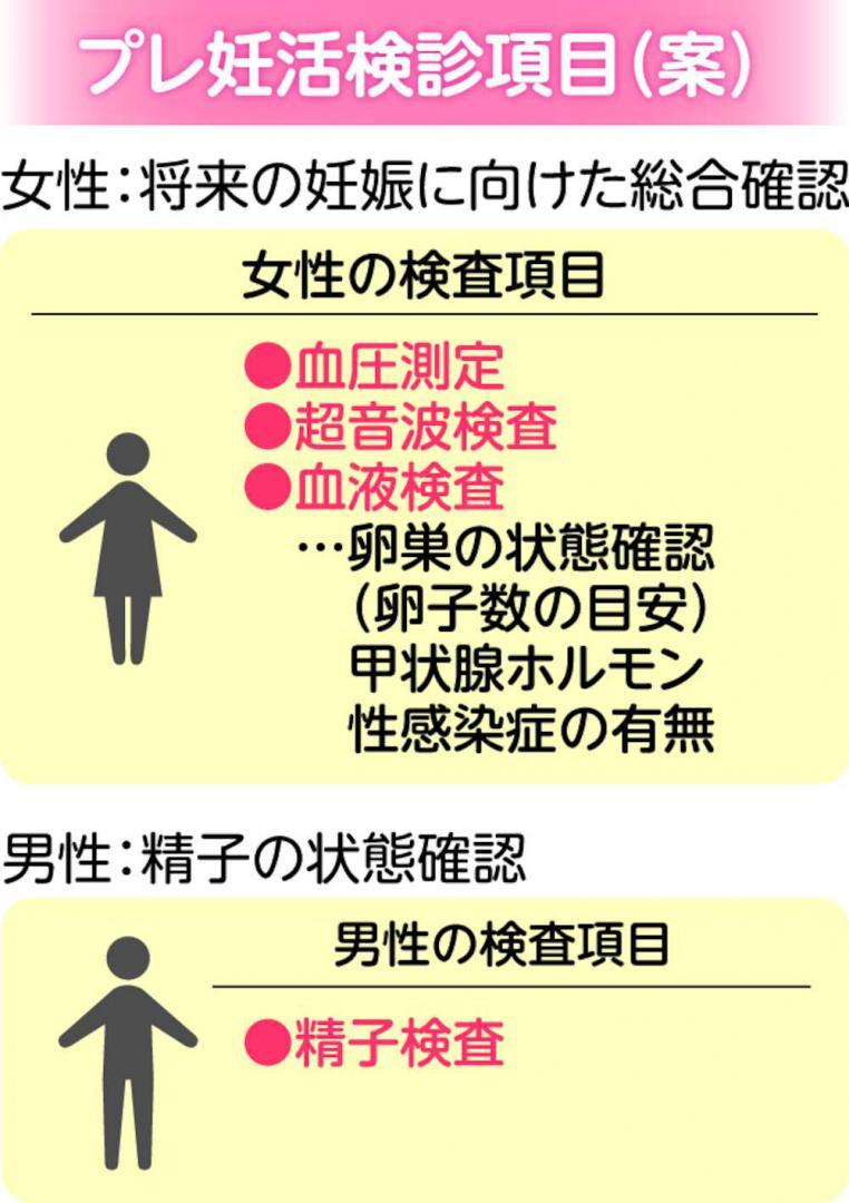 具体的な健診項目は検討中だが、女性は卵子数の目安を含む卵巣の状態、甲状腺ホルモンのバランス、性感染症の有無を調べる血液検査をはじめ、血圧測定、子宮の様子を確認する超音波検査などを想定する。男性は精子検査で状態を確認する。