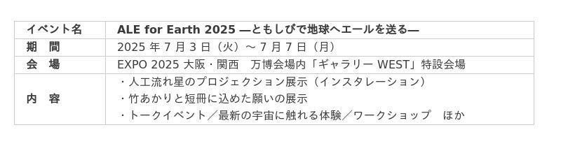 「科学を社会につなぎ 宇宙を文化圏にする」をミッションとする株式会社 ALE(本社:東京都港区、代表取締役社長:岡島礼奈、以下 「ALE」)は、2025 年 7 月 3日~7月7日に大阪・関西万博(EXPO 2025) において、宇宙と祈りをテーマにしたインスタレーションイベント 『ALE for Earth 2025 ―ともしびで地球へエールを送る―』 を実施いたします。
