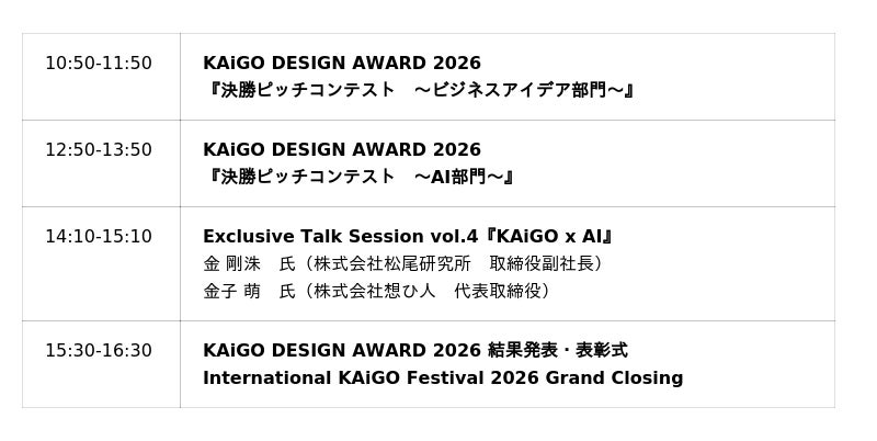 - 全国3ヵ所の地方予選を勝ち抜いたファイナリストが最終ピッチを行う「KAiGO DESIGN AWARD 2026」。会場ではプロダクトデザイン部門ファイナリストへの一般投票も実施。